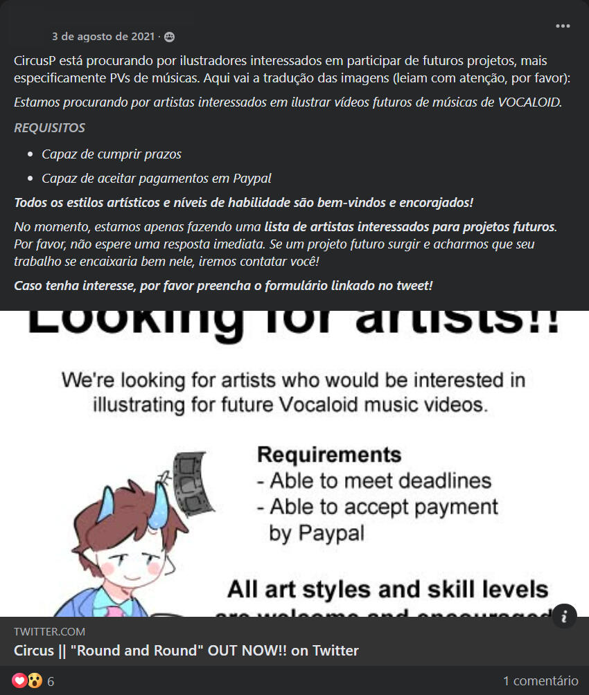 Apesar do meu foco atual ser em temas envolvendo entretenimento no geral (Ex.: música, desenhos animados e HQs), quaisquer outros são aceitos. No entanto, deve-se ter em mente que o valor final do pedido pode sofrer alterações conforme a complexidade do assunto e quantidade de revisões necessárias.O pagamento do pedido é efetuado via Pix e deve ser feito parcialmente logo após receber o orçamento. Em caso de cancelamento durante a produção, o valor antecipado não poderá ser reembolsado. Negociações são bem-vindas, desde que não sejam absurdas.O prazo de entrega é de 7 dias úteis, mas pode variar dependendo do projeto. Possíveis imprevistos que afetem o andamento do projeto serão informados antecipadamente.